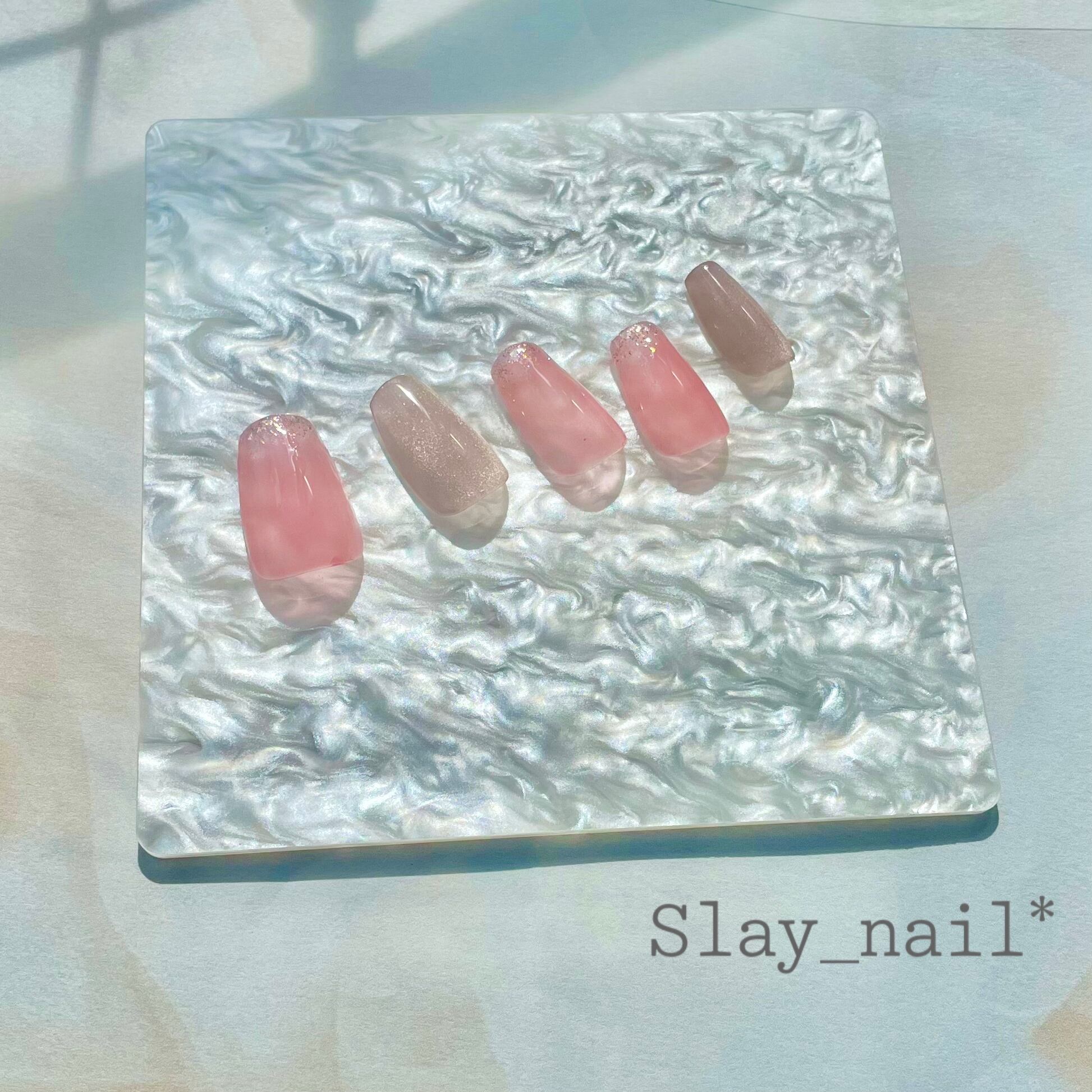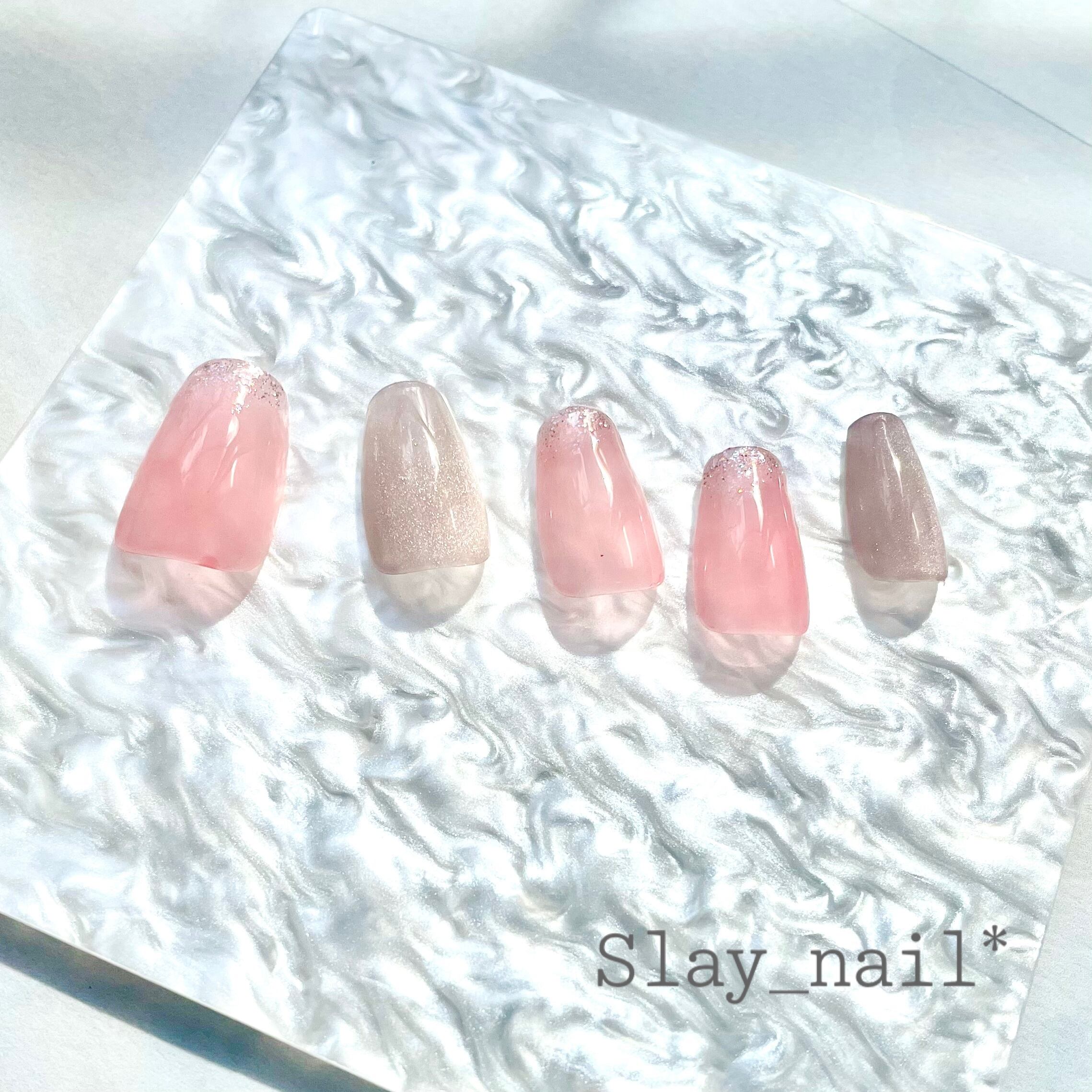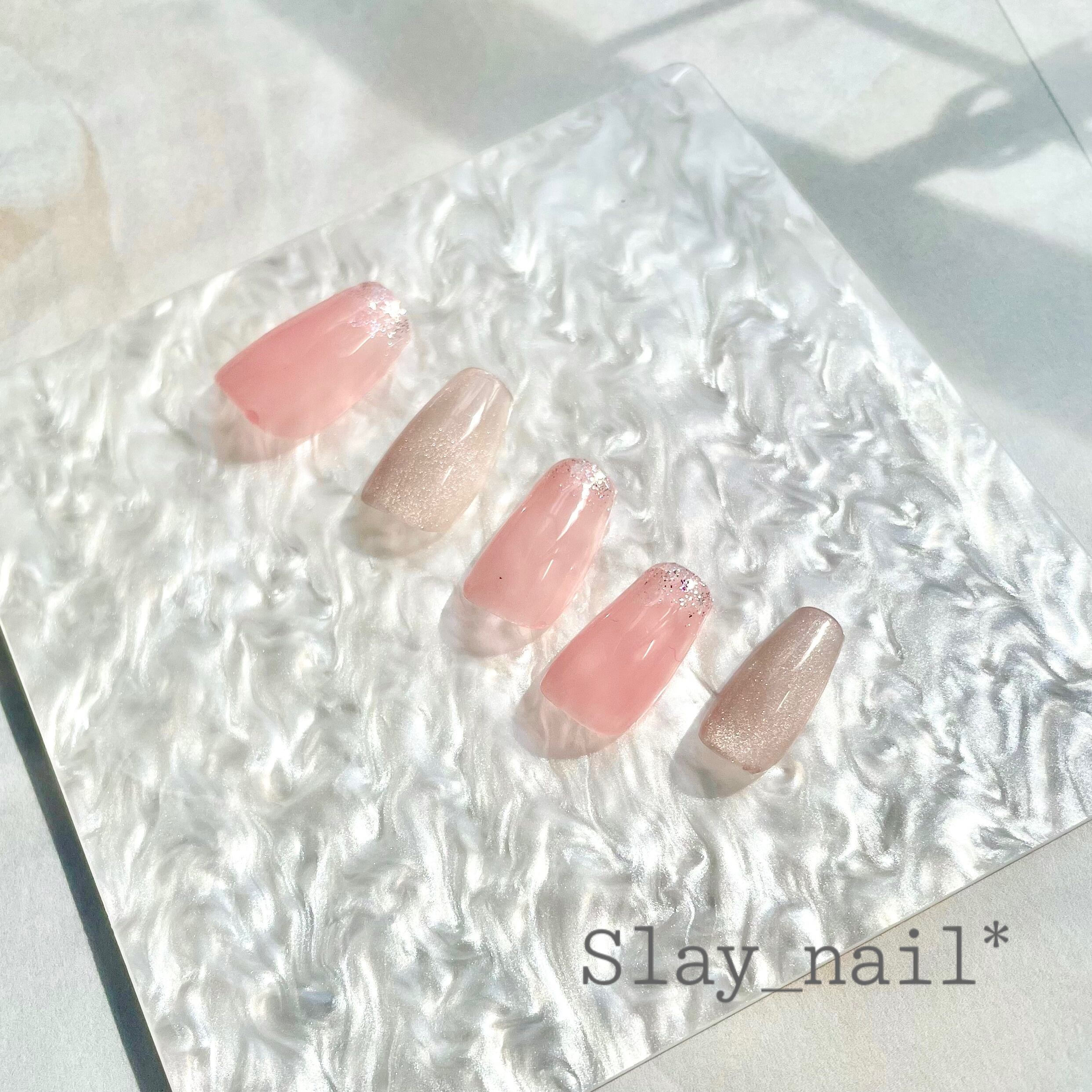 薄いピンクの先端にラメを散らし、