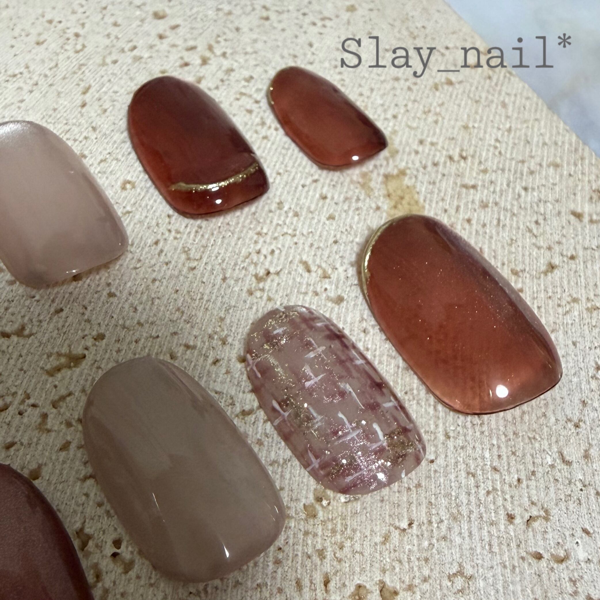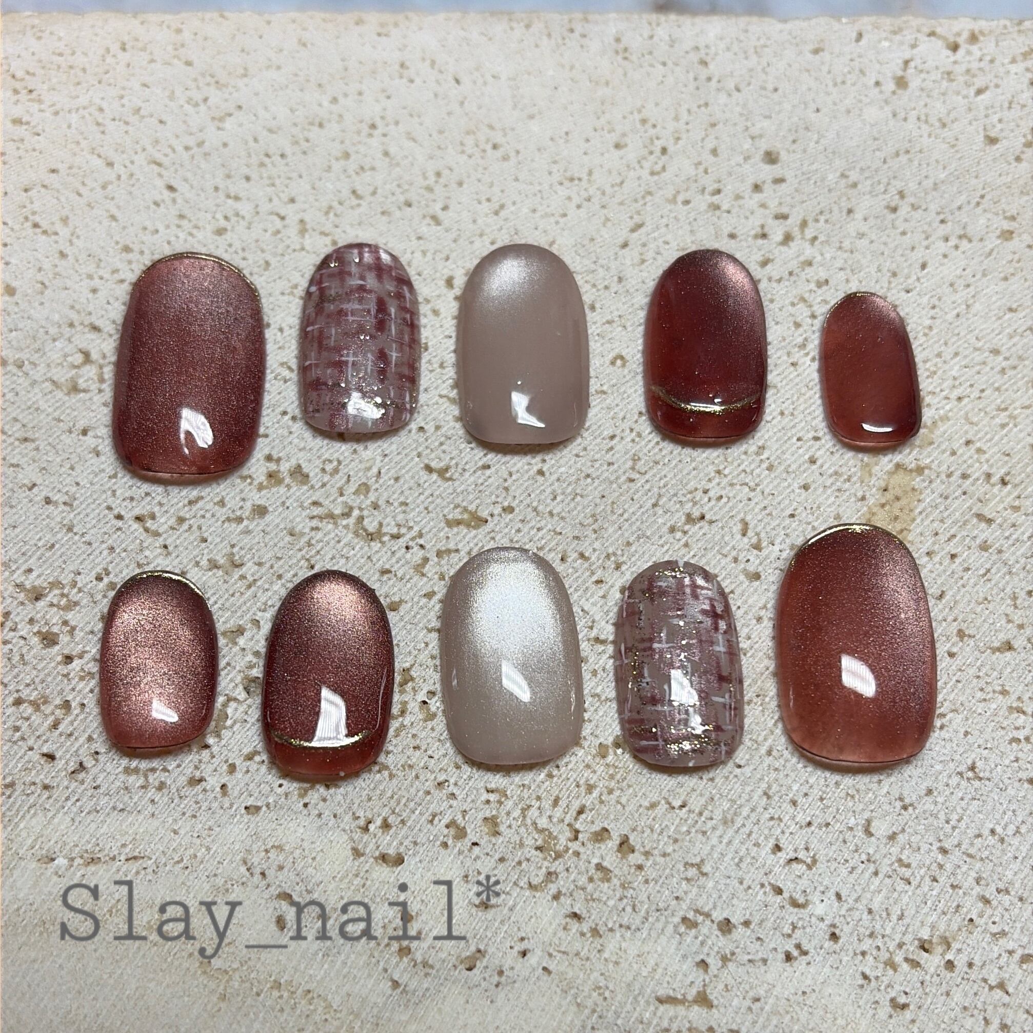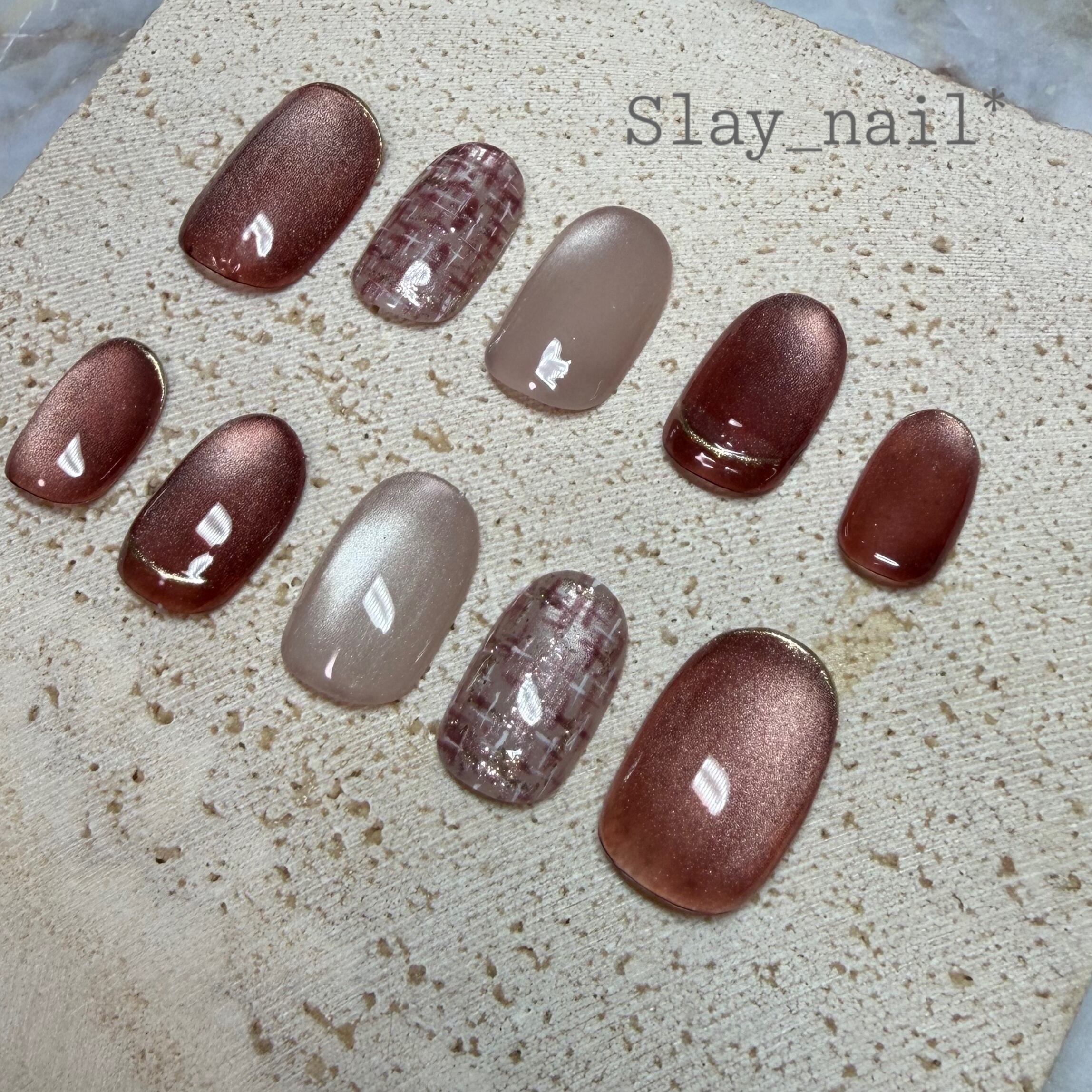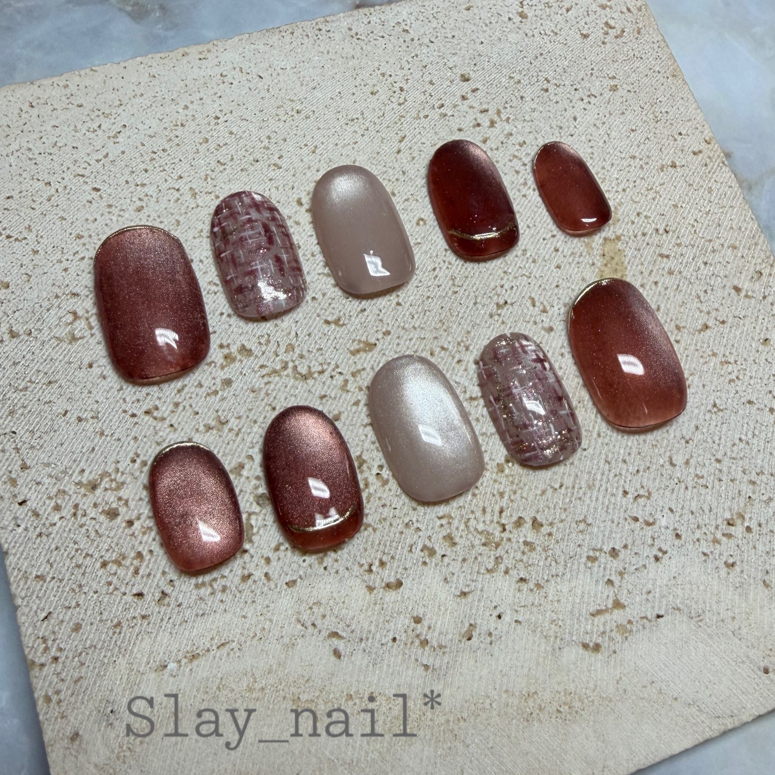 レッドブラウンのマグネットネイルをベースにして、ポイントでツイードのアクセントを入れてみました。
